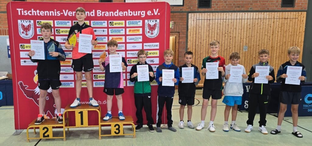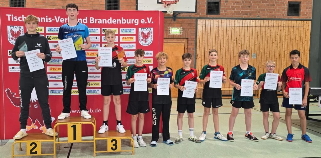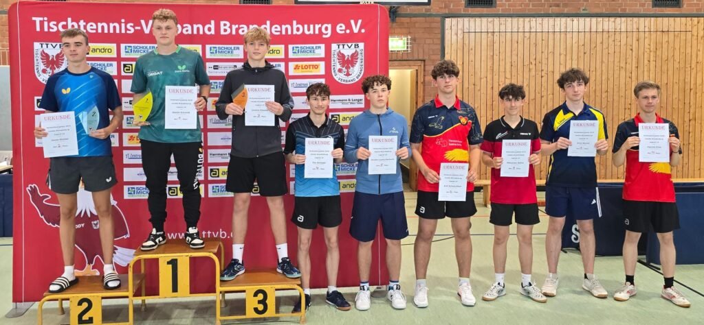 Insgesamt vier Jungs von uns starteten bei der Jugend 13. Dort war Max Mitfavorit, sodass es in Runde 8 wenig überraschend zum entscheidenden Duell um Platz 1 gegen Tim Witte kam. Einen Tag zuvor hatte Max das Match noch verloren, doch diesmal spielte er mit perfektem Fokus – zumindest in den ersten beiden Sätzen, die er deutlich gewann. Angefeuert vom Frankfurter Publikum konnte sein Gegner Tim zum 2:2 ausgleichen. Im 5. Satz setzte sich Max jedoch schnell ab und gewann am Ende verdient mit 11:8.
