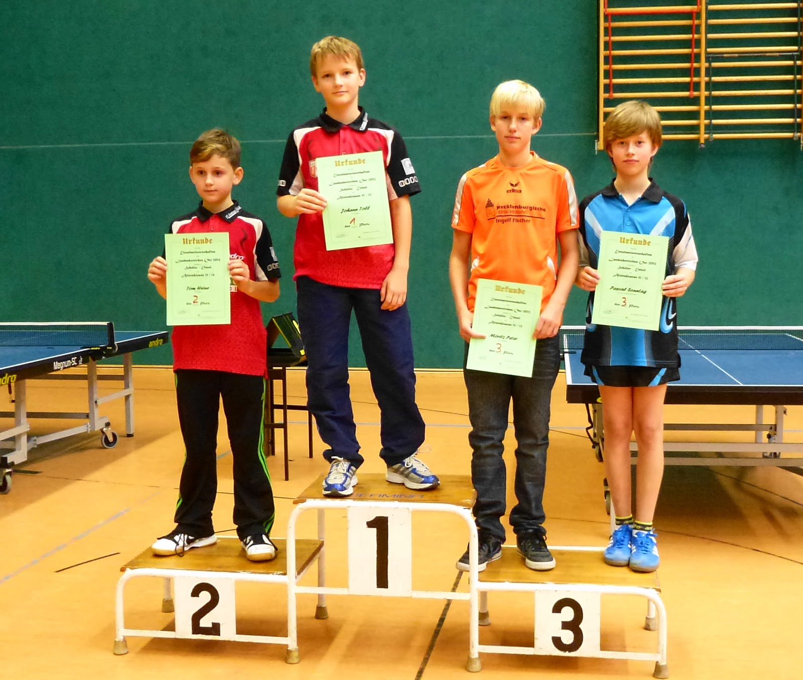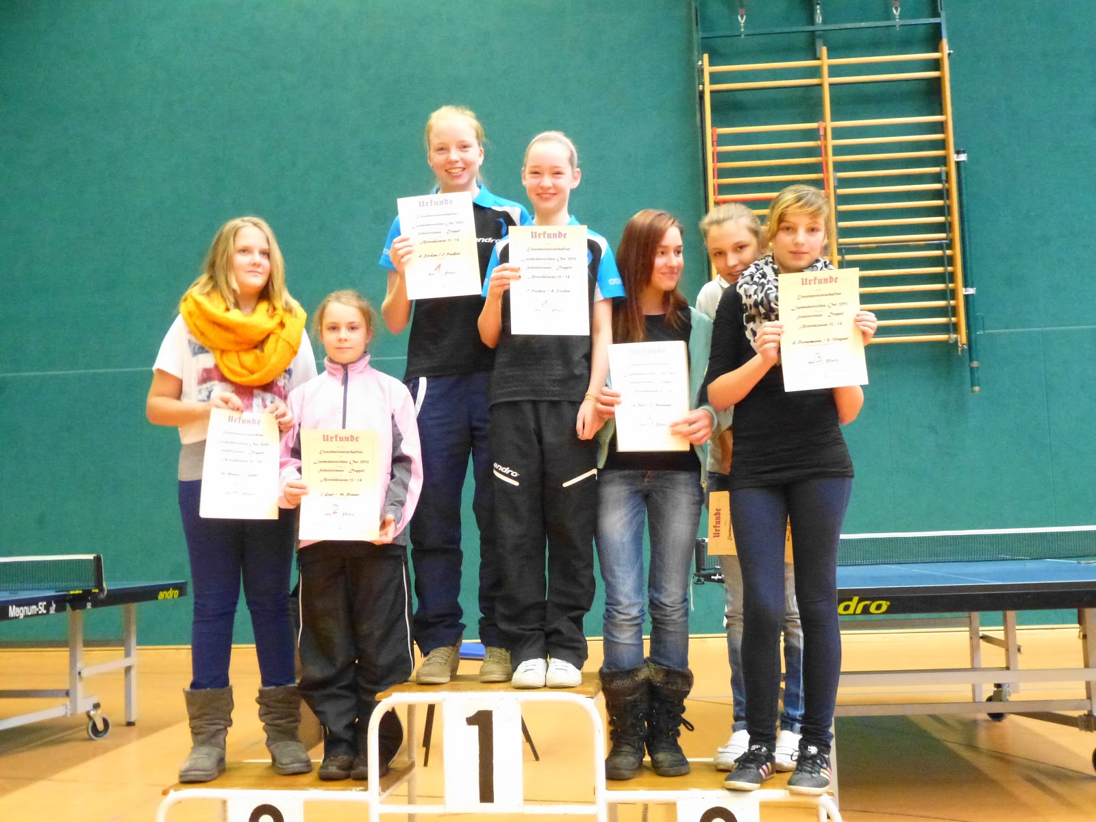 In der Altersklasse der 11/12-Jährigen konnte sich Marie durchsetzen. Nach ihrer 3-monatigen Zwangspause ist sie auf dem besten Wege an ihre alte Leistungsstärke anzuknüpfen. Im Finale besiegte sie die 3 Jahre jüngere Alina Schön vom ESV Prenzlau. Chiara teilte sich mit Katja Ott den dritten Platz. Lena konnte an diesem Tag nicht überzeugen und musste sich bereits in der Gruppenphase verabschieden. Im Doppel sorgte Chiara zusammen mit Alina für eine große Überraschung. Nach einem Freilos konnten sie zunächst in einem spannenden Match gegen die großgewachsenen Mädchen Ott und König gewinnen, bevor sie im Finale gegen Marie und Lena erfolgreich überzeugen konnten.