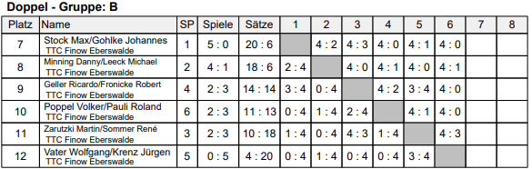 In der B-Klasse setzten sich am Ende die Favoriten Johannes und Maximilian durch. Allerdings wurde es ihnen nicht leicht gemacht: Gegen die stark aufspielenden Robert und Ricardo gab es lediglich ein knappes 4:3, und auch im entscheidenden Spiel um Platz eins gegen Michael und Danny mussten sie nach den Einzeln einen 0:2-Rückstand hinnehmen. Mit einem starken Doppel drehten sie die Partie jedoch noch zum 4:2.