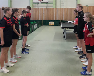 Heimspiel der 2 Schüler, Leonie, Joshua, Luisa und Anne, gegen Hohen Neuendorf, Tomke, Emil, Sunny und Greta, enge Kiste, soweit, so richtig! Wir erwarteten, gegen die beiden Jungs alles zu verlieren und hofften, dafür gegen die Mädels zu punkten, um ein Unentschieden zu holen. Dementsprechend wichtig schätzten wir die Doppel ein und waren total überrascht, beide gewinnen zu können, vor allem der Sieg von Joshua und Anne, einem sehr ungleichen Pärchen, das noch nie zusammen gespielt hatte, gegen Tomke und Emil grenzte Satz für Satz an ein kleines Wunder.