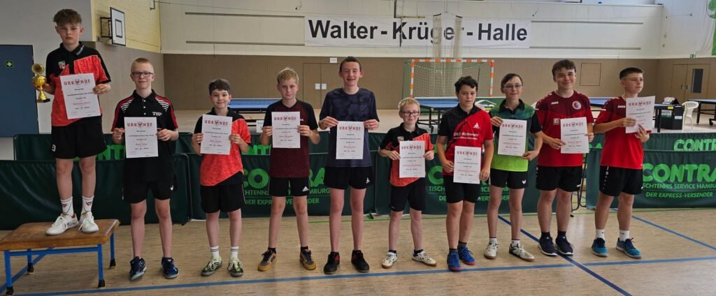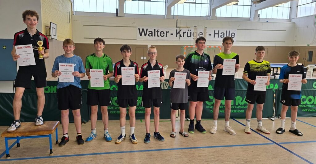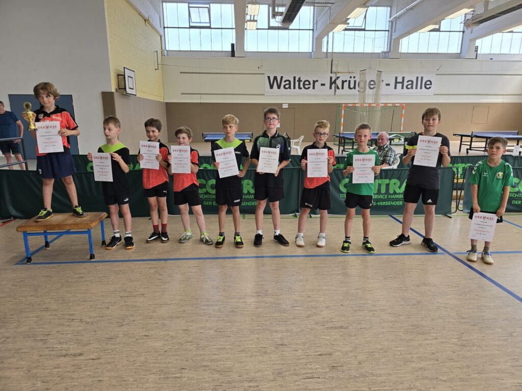 Platz 2 belegte am Ende mit Emil ein starker Konkurrent vom TTV Top Spin Bernau, der im letzten Match des Tages ein 0:2 gegen Karl leider noch zum 3:2 drehte. Das wurde Karl zum Verhängnis der nun Spiel- und Satzgleich mit Nils von Platz 3 auf Platz 4 gerutscht war. 6 Bälle war Nils am Ende besser und freute sich somit über den 3. Platz. Genauso wie Karl und Nils überzeugte auch Ben mit einer starken 6:3 Bilanz. Im Satzverhältnis war er allerdings deutlich schlechter als die Beiden und wurde somit Fünfter. Nicht sein bestes Turnier spielte Lennard der sich auf Platz 6 einreihte.