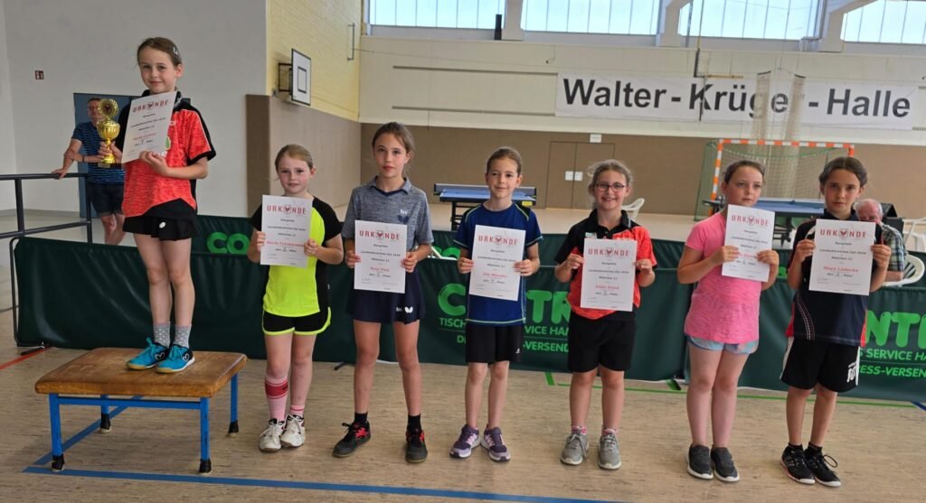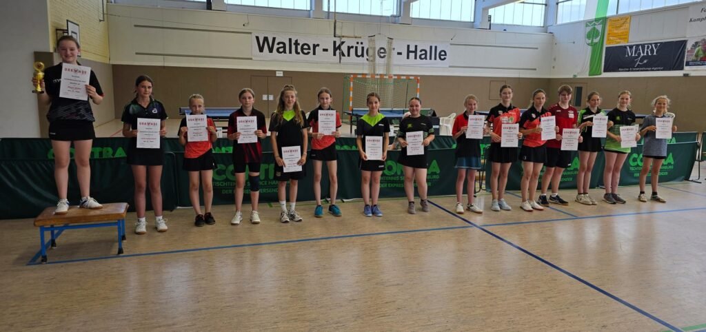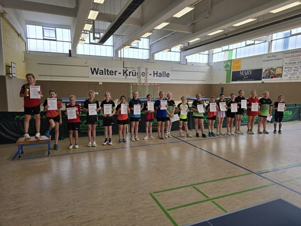 5 Spielerinnen starteten für uns bei den Mädchen 13. Insgesamt gab es dort 19 Starterinnen, die in 3 Vorrundengruppen aufgeteilt wurden. Marie startete als jüngste Spielerin sehr gut, doch beendete ihre Gruppe mit 4:2 Spielen etwas unglücklich nur auf Platz 4. Die gleiche Bilanz, aber am Ende auf Platz 2 stand Mia. Sie zog somit in die Endrunde um Platz 1 – 6 ein.