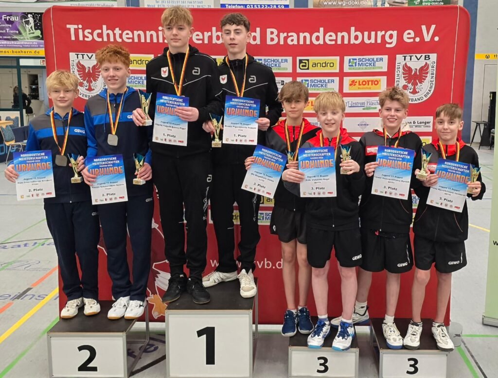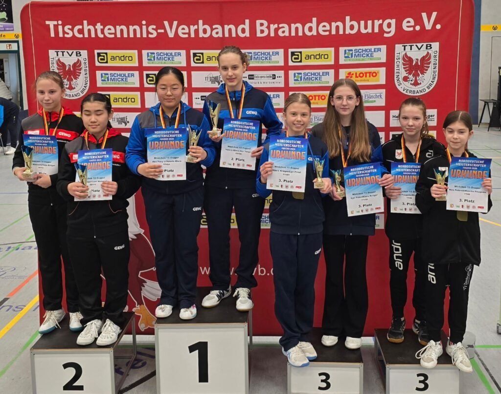 Für Medaillen sorgten unsere Spieler im Doppelwettbewerb. Max schied gemeinsam mit Tim leider bereits im Achtelfinale aus, während Karl mit seinem Partner aus Berlin im Viertelfinale das Nachsehen hatte. Bis ins Halbfinale schaffte es Mira mit ihrer Partnerin Mascha, musste sich dort jedoch nach einem spannenden Spiel mit 2:3 geschlagen geben. Für unsere erst 11-jährige Spielerin bedeutete dies dennoch einen starken dritten Platz im Doppel.