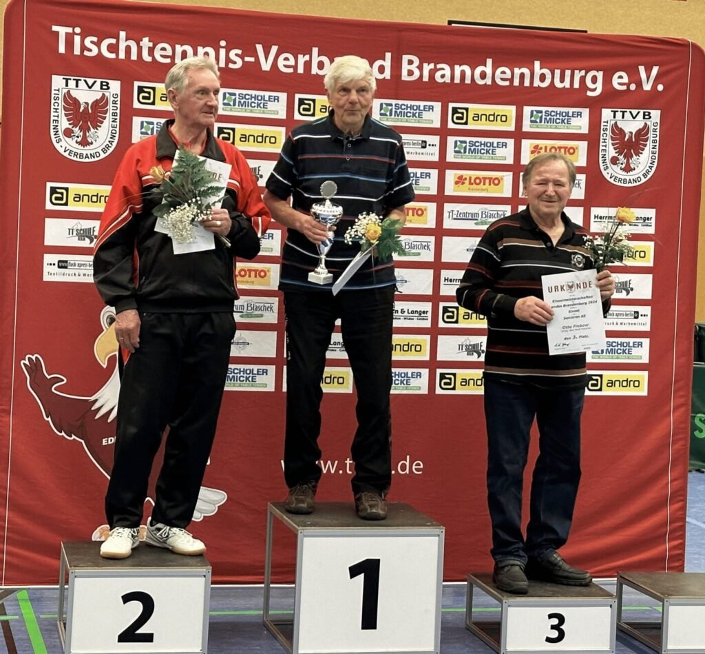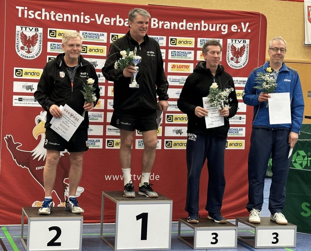Insgesamt 6 Finower waren am vergangenen Wochenende bei der Landesmeisterschaft der Senioren in Vetschau aktiv. Eigentlich hatten sich 8 Mitglieder unseres Vereins dafür qualifiziert, doch Katrin und André mussten leider kurzfristig passen. Beide hätten auch sehr gute Chancen gehabt als Mitfavoriten in ihren Turnierklassen sich für die Norddeutsche Meisterschaft zu qualifizieren. Dieses Ziel hatten auch Holm, Erik, Olaf und Egon, die am Ende tatsächlich auch alle ihr Ziel erreichten. Holm und Erik, beide in der Altersklasse Ü60 aktiv, hatten im starken Teilnehmerfeld ordentlich mühe ihrer Favoritenrolle gerecht zu werden. Am Ende standen sie sich aber im Finale gegenüber, welches Holm nach 1:4 Rückstand im 5. Satz noch für sich entscheiden konnte. Somit Gold für Holm und Silber für Erik. Im Doppel hatten beide auch ordentlich zu kämpfen, doch am Ende reichte es mal wieder für den Landesmeistertitel.