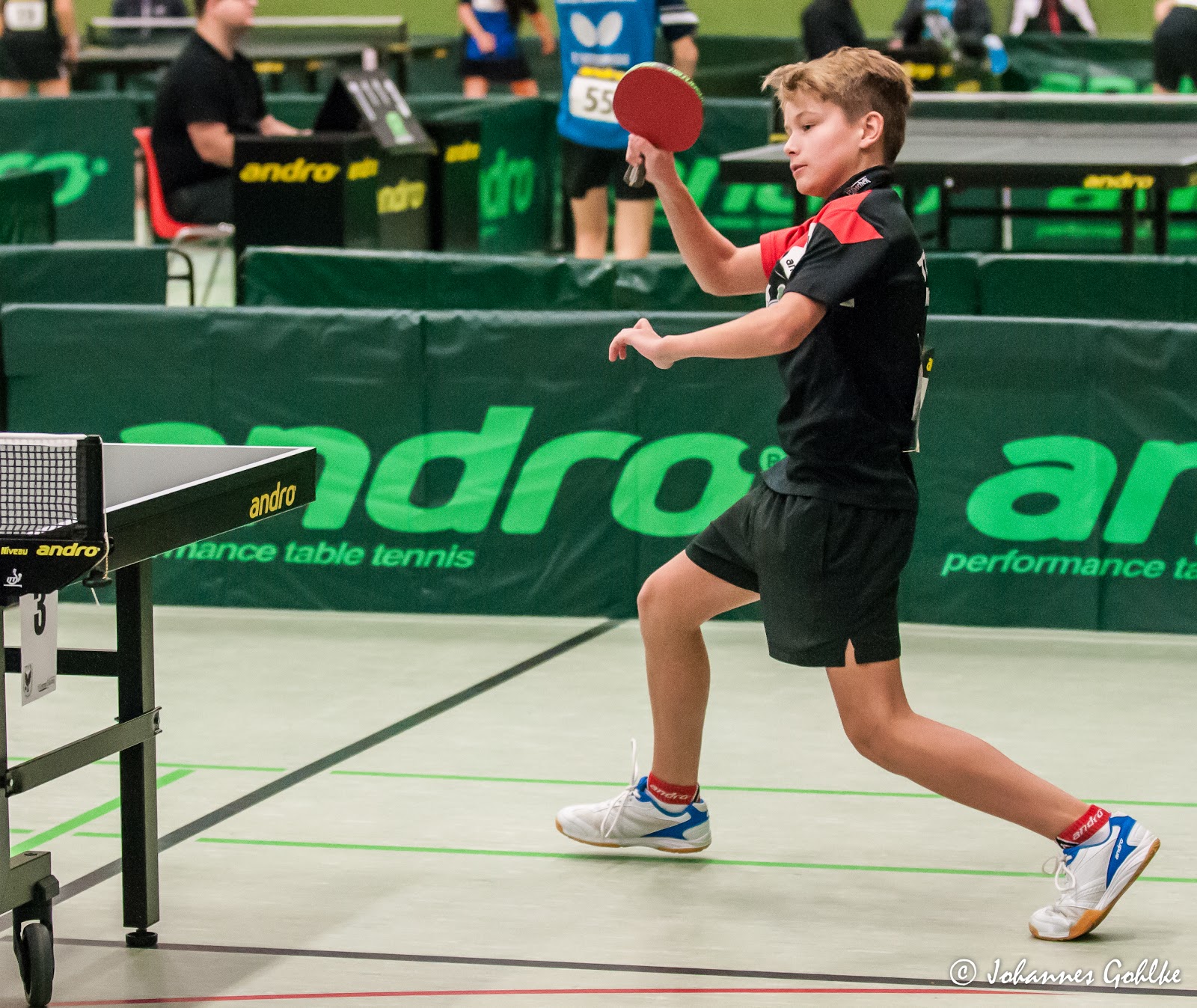 Und tatsächlich war die Möglichkeit für alle 4 da ins Halbfinale einzuziehen. Doch leider verlor Louis nach 1:0 Führung noch 1:3 gegen Fabian Gehrke, den er bei der Verbandsrangliste noch bezwingen konnte. Matti siegte in einem sehr schönen Spiel 3:1 über Joey Voss. Tom überzeugte mit einem 3:0 gegen Pit Fischer und Nils gewann nach 2:0 Rückstand, die nächsten 2 Sätze gegen Hegen jeweils zu 5 und war auch schon im 5. Satz mit 4:0 in Führung! Nun kam allerdings die Auszeit bei René und plötzlich wendete sich leider das Blatt. Somit scheiterte Nils kurz vor der Sensation. Für seine starken Leistungen gegen die beiden späteren Finalisten Gehrke und Hegen wurde Nils zwar nicht mit einer Medaille belohnt, aber er kann wirklich stolz auf seine Leistungen sein!