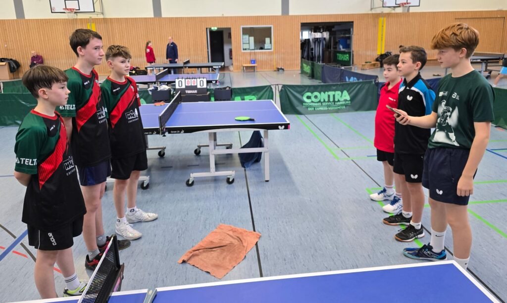 Anschließend war um 12 Uhr auch unsere 4. Schüler gegen den TTC Frankfurt 2 gefordert. Ohne Spitzenspieler Max, dafür mit Newcomer Richard, der sein Punktspieldebüt gab, sowie Max’ Zwillingsschwester Edda, gab es ein 5:5. Großen Anteil hatte hier Gregor mit 3,5 Punkten am Endergebnis. Arne steuerte die restlichen Punkte bei. Edda und Richard sammelten wertvolle Wettkampferfahrungen.