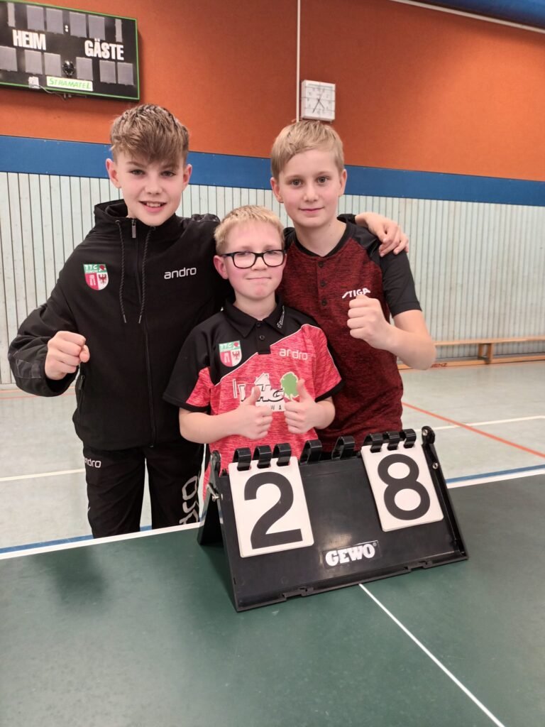 Um die Meisterschaft geht es für unsere 1. Schülermannschaft. Diese war am Sonntag gleich zwei Mal Auswärts gefordert. Am Vormittag ging es im südlichen Zipfel Brandenburgs gegen den VfB Doberlug-Kirchhain. Karl, Lennard und Hannes zeigten eine souveräne Leistung und bestätigten ihre Favoritenrolle. Mit 10:0 gewannen sie dieses Spiel und machten sich auf den Weg nach Königs Wusterhausen. Dort stand nämlich das 2. Spiel des Tages gegen die WSG KW an. Sie boten immerhin zwei Spieler auf die leistungsmäßig auf Augenhöhe mit unseren Jungs sind, so dass ein umkämpftes Spiel erwartet wurde. Dies wurde es auch, aber zum Glück meist mit einem guten Ausgang für unsere Jungs. Nur Lennard und Karl verloren jeweils ein Match, während Hannes ungeschlagen blieb. Mit 8:2 gewannen unsere Jungen das Match und setzten sich damit an die Tabellenspitze der Verbandsliga Jungen 15.