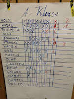 Allerdings gab es hier eine A- und B-Klasse, so das immer einem Spieler der A-Klasse, ein Spieler der B-Klasse zugelost wurde. Nach jedem gewonnen Doppel durften die Sieger ein Kreuzchen hinter ihren Namen machen, so das man am Ende ganz einfach zählen konnte wer denn die meisten Kreuzchen hat.