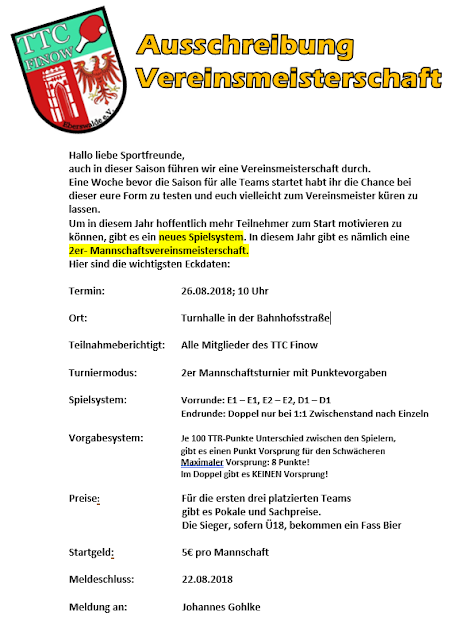in gut 2 Wochen ist es wieder soweit, die Vereinsmeister 2018 werden gesucht.