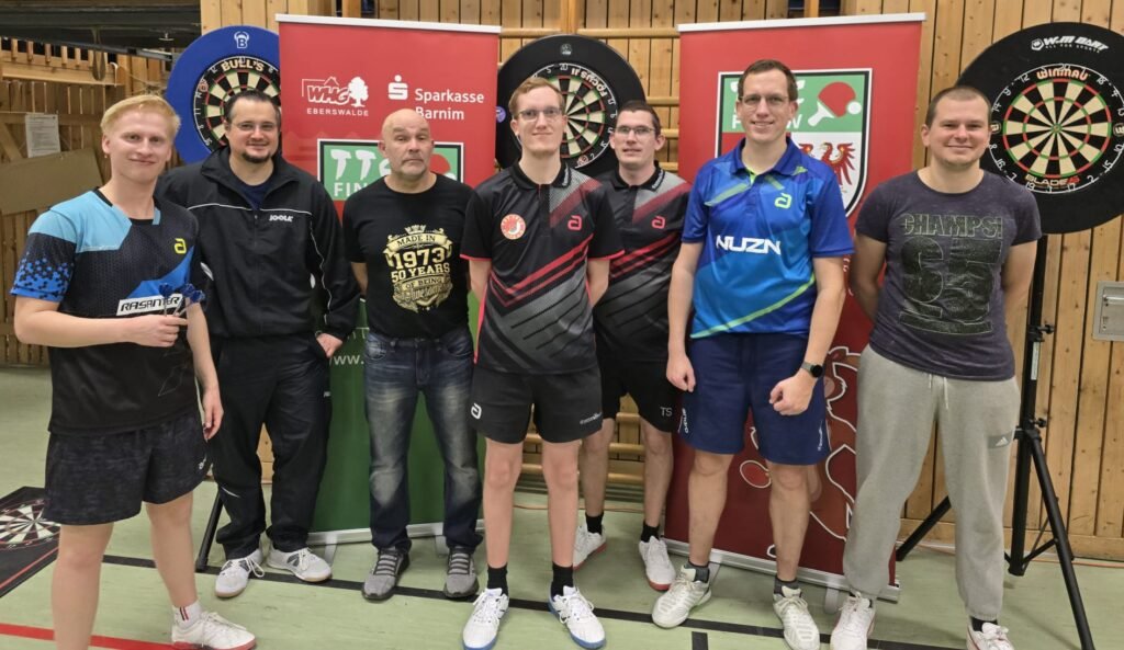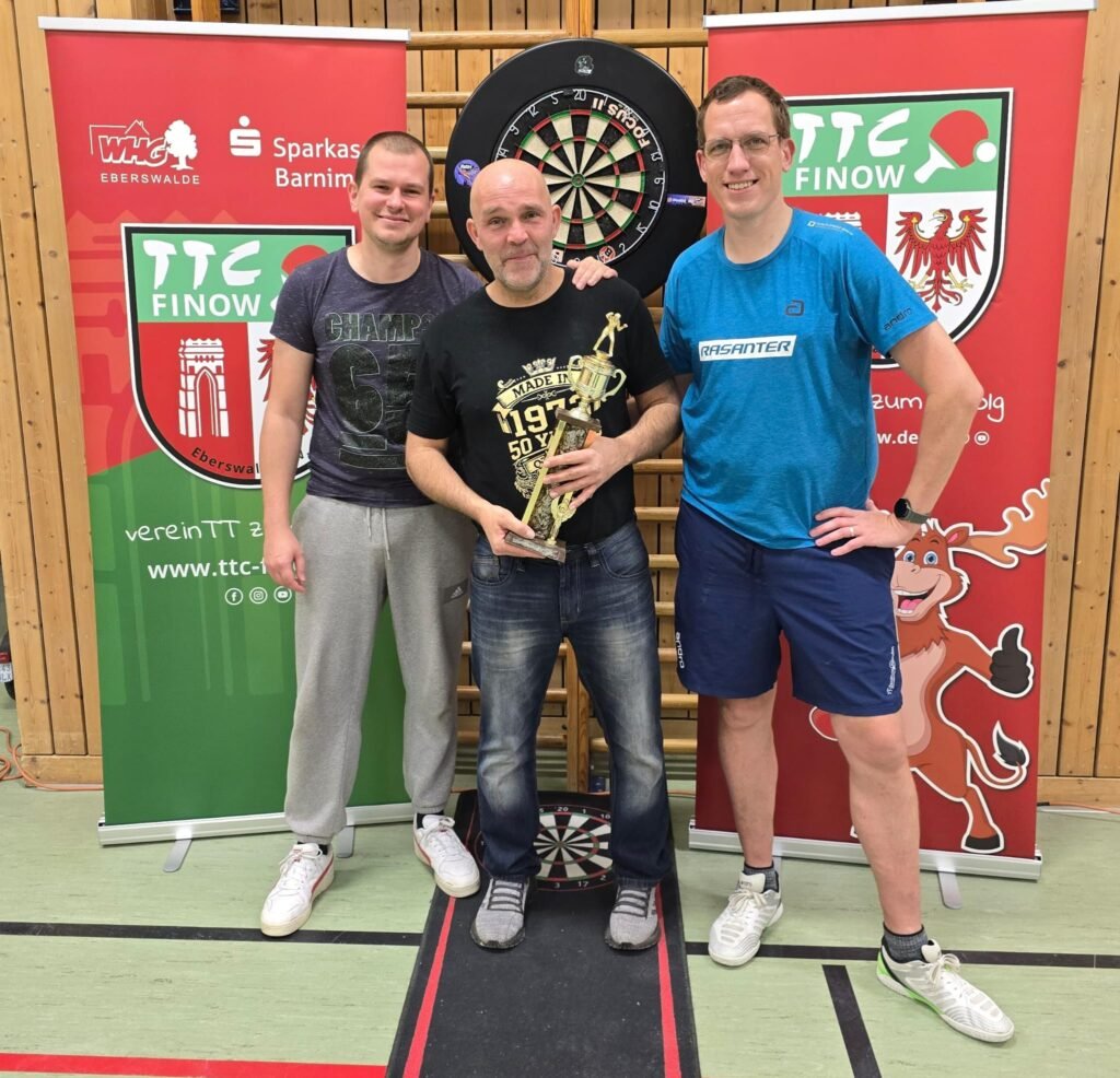Der Zeitplan hielt, sodass wir kurz nach 20 Uhr mit dem Dartsturnier beginnen konnten. Sieben motivierte Dartsspieler traten an drei Dartboards an und zeigten, dass sie nicht nur mit dem Tischtennisschläger, sondern auch mit den Pfeilen punkten können. Besonders häufig landeten Würfe in der Triple-20 und Triple-19. Parallel verfolgten wir auf dem großen alten Vereinsfernseher – der nun Erik heißt – die Viertelfinalspiele der Darts-WM.