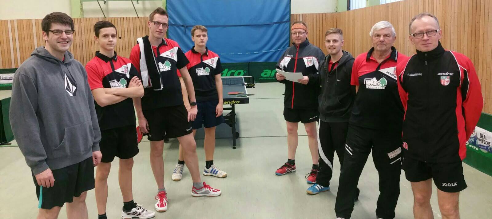 Revanche souverän geglückt – so lässt sich das Ergebnis des vereinsinternen Duells gegen unsere zweite Vertretung wohl am besten zusammenfassen. Bereits nach den Doppeln standen die Zeichen für uns auf Sieg. Thilo und Thoralf gewannen das 1er Doppel gegen Johann und Hannes mit 3:1. Egon und Benny hatten beim 3:0 über Johannes und Tom wenig Mühe. Auch die erste Einzelrunde konnten wir komplett für uns verbuchen. Egon bezwang Johannes, der große Gegenwehr leistete, in einem spannenden Duell mit 3:2. Thilo wiederholte seinen Sieg aus der Hinrunde gegen Johann. Benny bezwang Hannes überraschend deutlich mit 3:0 und Thoralf zeigte beim 3:1 über Tom, dass mit seinem gefürchteten Vorhandtopspin wieder zu rechnen ist. Die zweite Einzelrunde verlief dann schon um einiges umkämpfter. Egon konnte leider keine Revanche für die Hinrundenniederlage gegen Johann nehmen und verlor 10:12 im Entscheidungssatz. Kapitän Thilo siegte gegen Johannes zwar mit 3:0, doch dabei wurden zwei Sätze erst in der Verlängerung entschieden. Gegen Tom, den Benny schon unzählige Male betreute und deshalb eigentlich hinreichend kennen sollte, spielte der Team-Jüngste (mit 25 Lenzen – langsam müssen die Jungschen nachrücken!) zu oft taktisch unklug und quälte sich zu einem 3:2-Sieg, wobei er im vierten Satz schon einen Matchball abwehren musste. Dies bedeutete gleichzeitig den umjubelten Endstand von 8:1! Allerdings gilt zu bedenken, dass wir davon profitierten, dass Arvid und Rico nicht für die Zweite an den Start gehen konnten. Hätte nur einer der beiden gespielt, wäre der Rückrundenauftakt aller Voraussicht nach anders verlaufen. Der Zweiten wünschen wir weiterhin viel Erfolg im Aufstiegsrennen! Wir werden versuchen, den derzeit vierten Tabellenplatz noch etwas zu verbessern und dabei Euren Konkurrenten ein Bein zu stellen. Einen großen Dank auch an Thomas, der sich dieses Wochenende für die kommenden Aufgaben schonte, aber die Funktionen als Schriftführer, Coach, Motivator und Bierholer übernahm!