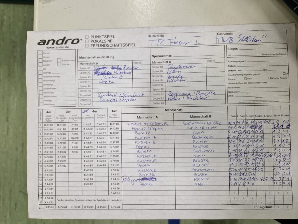 Nach einer Punkteteilung in den Doppeln verliefen auch die Einzel total ausgeglichen. Vor der letzten Einzelrunde stand es 5:5, so dass eine Punkteteilung gut möglich war. Doch nun scheiterte ausgerechnet Spitzenspieler Christoph, der seine ersten zwei Einzel gewinnen konnte, in seinem 3. Einzel. Marcel machte zwar noch den erwarteten Punkt gegen Sportfreundin Jana Bessert, die Tochter unseres Urgesteins Siegmar, doch André und Willi schafften gegen die favorisierten Bernauer leider keine Überraschung in den letzten Einzeln. Mit 6:8 verlor unser Team somit knapp das Spiel. Die Chancen auf den Klassenerhalt sind aber weiterhin da. 😊