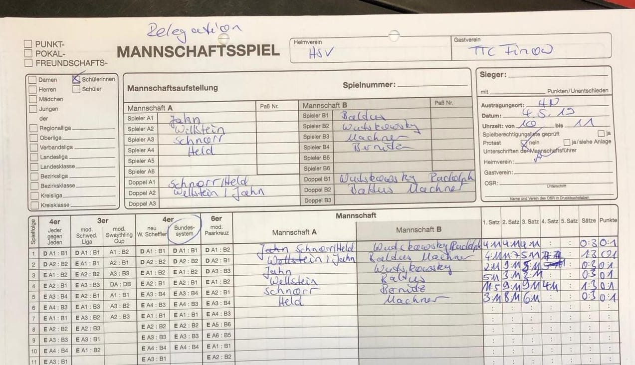 1. Schüler – Hohen Neuendorfer SV 6:1Das fällige Relegationsspiel um den Platz bei der Norddeutschen Mannschaftsmeisterschaft, konnte unsere 1. Schüler deutlich gewinnen. Obwohl mit Matti und Nils die momentan stärksten Spieler zu Hause gelassen wurden, fiel das Endergebnis am Ende ziemlich deutlich aus. Überraschend konnten gleich beide Doppel gewonnen werden.