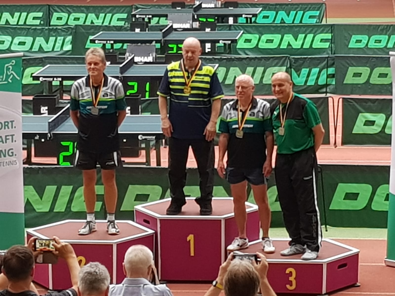 Doch unser Spieler der 5. Mannschaft ragte nicht nur im Einzel heraus. Im Doppel gewann er zusammen mit Peter Gerigk und im Mixed zusammen mit Heidi Wunner ebenfalls den Deutschen Meistertitel! Was für ein Turnier für den ehemaligen Weltranglisten Top30-Spieler!