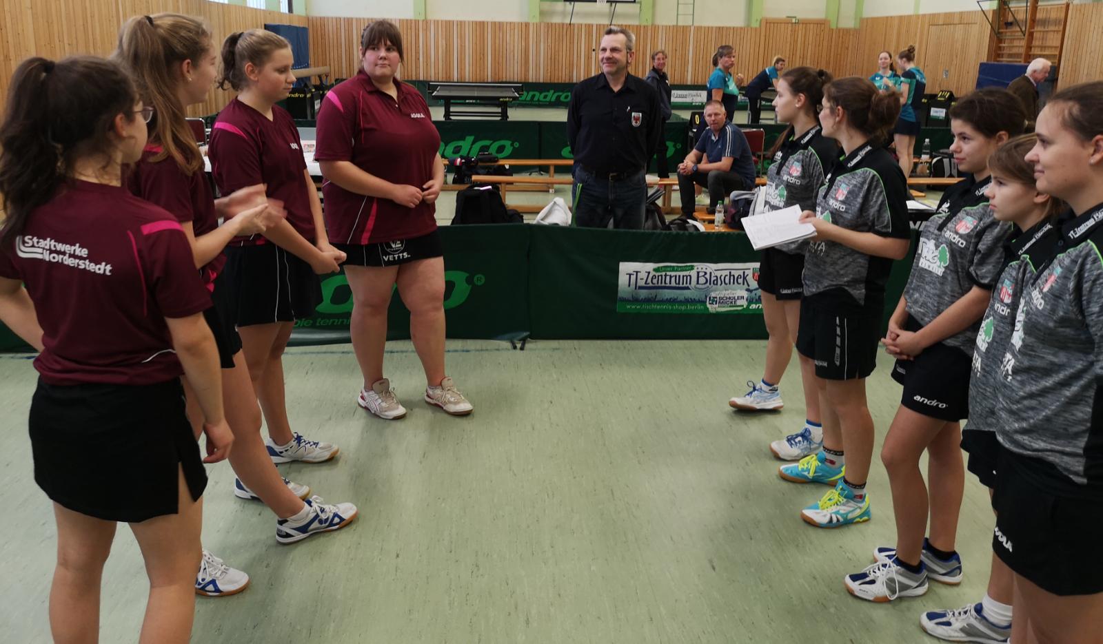 Zu Gast waren die sympathischen Mädels vom Cottbuser TT-Team. Leider etwas gehandicapt ins Spiel ging ihre Nummer 1, Lea Haupt. Das merkte man bereits im Doppel, in dem sie nicht jeden Ball erlaufen konnte. Trotzdem hatten Annie und Isa mit ihr und ihrer langjährigen Doppelpartnerin Lisa Wolschina, schwer zu kämpfen, doch gewannen am Ende unter großen Beifall mit 12:10 im Entscheidungssatz. Währenddessen machten auch Katrin und Gabi, die in den Einzeln Anka den Vortritt ließ, ein tolles Spiel gegen Lethal/Wislaug und gewannen mit 3:1.
