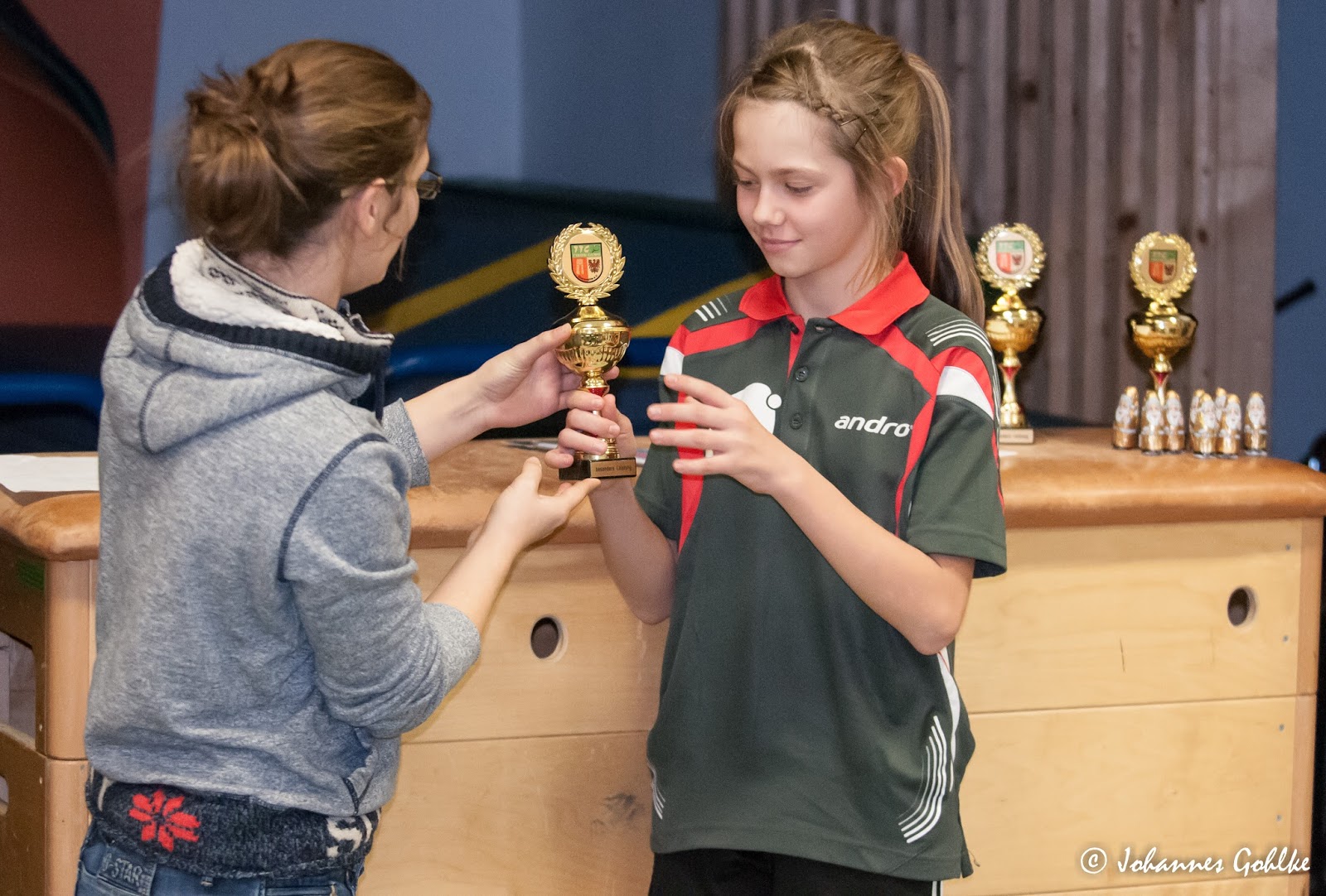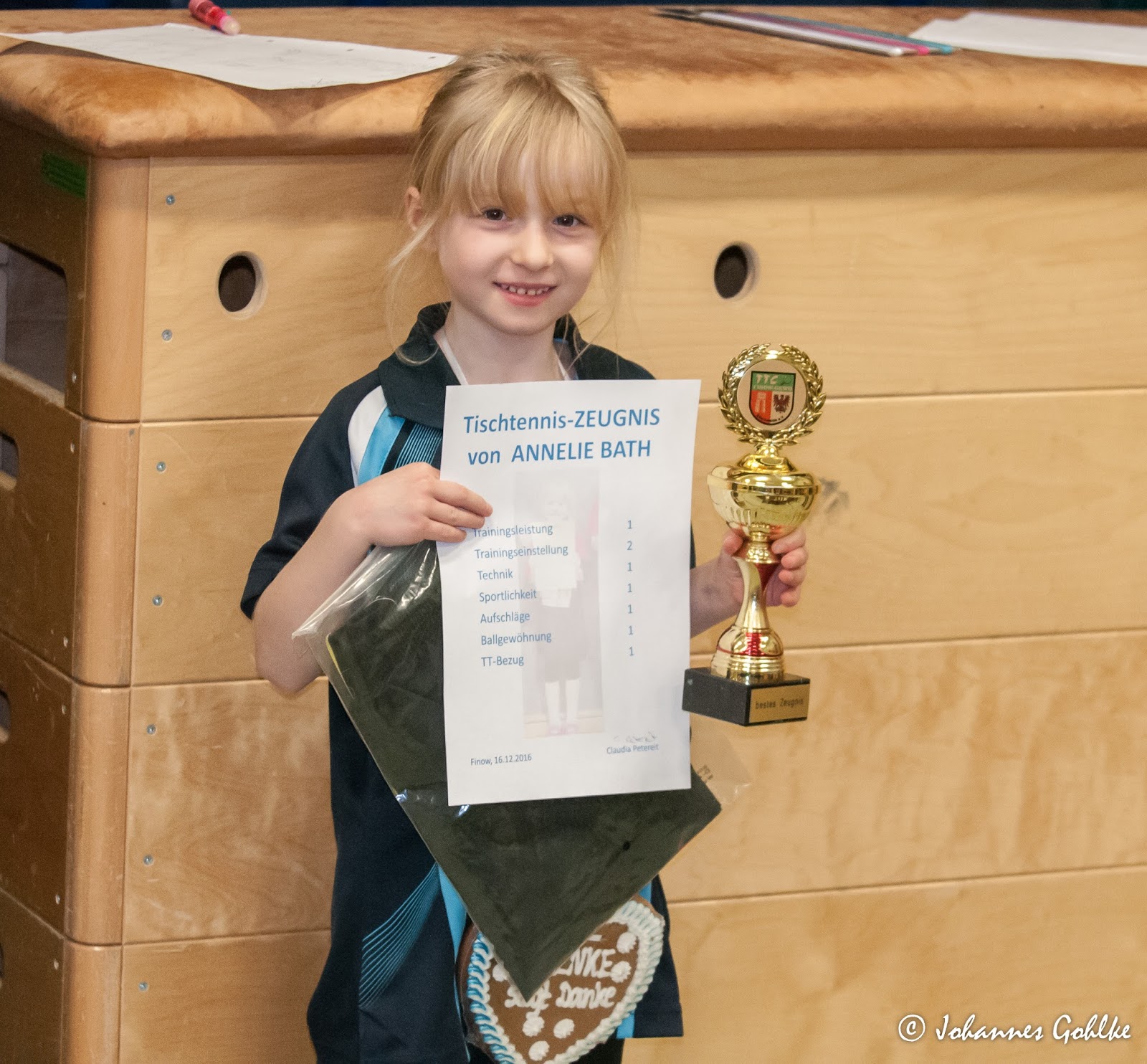Neben der obligatorischen Siegerehrung, gab es auch wieder Auszeichnungen für besondere Leistungen im Jahr 2016. Ausgezeichnet wurden Sophia, Leonie, Johannes B. und Johannes G.. Außerdem bekam unsere Annelie den Pokal für das beste Tischtenniszeugnis. Lediglich eine 2 hat sich auf ihr sonst nur aus Einsen bestehendes Zeugnis geschmuggelt.