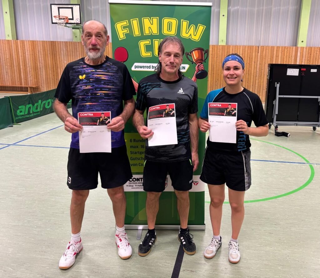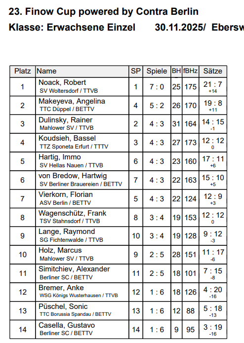 Beim 23. Finow Cup war Dauerbrenner Robert Noack ganz vorn. Der Woltersdorfer gewann ohne Spielverlust das diesmal recht schwach besetzte Turnier. Über den 2. Platz freute sich im ausgeglichenen Feld Angelina Makeyeva vom TTC Düppel. Den 2. Podestplatz erspielte sich Rainer Dulinsky mit Platz 3.