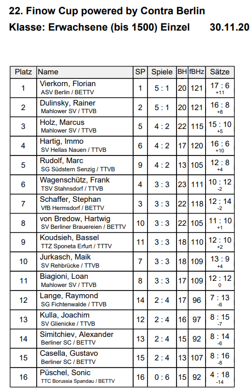 Beim 22. Finow Cup musste das Satzverhältnis über den 1. Platz entscheiden da Florian und Rainer sowohl das gleiche Spielverhältnis als auch die identische Buchholzzahl und fBHz hatten. Hier hatte Dauerbrenner Florian Vierkorn die Nase vorn und freute sich somit über den Turniersieg. Das Nachsehen und somit Platz 2 belegte Rainer Dulinsky. Das Treppchen komplettierte Marcus Holz, der Vereinskamerad von Rainer beim Mahlower SV.