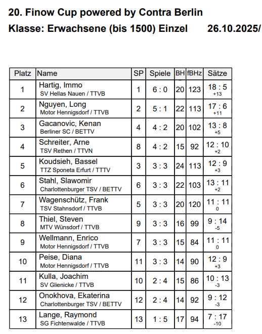 Beim 20. Finow Cup powered by Contra Berlin setzte sich am Ende Immo Hartig vom SV Hellas Nauen ungeschlagen durch. Platz 2 belegte Long Nguyen von Motor Hennigsdorf und den 3. Platz sicherte sich Kenan Gacanovic vom Berliner SC vor den weitgereisten Arne Schreiter (Niedersachsen) und Bassel Koudsieh (Thüringen).