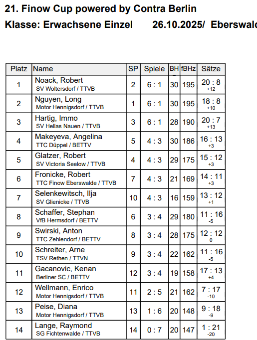 Beim 21. Finow Cup mischte von uns Dauerbrenner Robert mit. Er spielte stark auf und belegte am Ende Platz 6. Platz 1 belegte ein anderer Dauerbrenner. Denn Robert Noack konnte sich mal wieder in die Siegerliste eintragen. Der Kampf und Platz 1 war allerdings sehr umkämpft. Am Ende gewann er nur aufgrund des besseres Satzverhältnisses vor Long Nguyen. Long war nicht der einzige der bei beiden Cups auf dem Treppchen stand. Mit Immo Hartig schaffte es der Sieger des 20. Cups nun auf Platz 3.