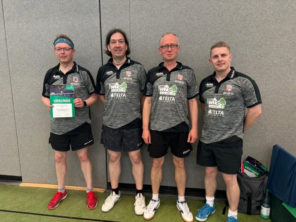 Nach einem starken 4:1 Auftaktsieg gegen den SV Hafen Rostock, bei dem besonders Spitzenspieler Thilo mit 2,5 Punkten überzeugte, sah es zu Beginn auch im 2. Match gegen den TSV 1891 Kassel-Oberzwehren ganz gut aus. Denn Thomas überzeugte mit einem 3:1 Sieg gegen den gegnerischen Spitzenspieler und auch Thilo lag bereits 2:0 vorn, verlor dann allerdings doch noch sein Match. Nach einer Niederlage von Benny im 3. Einzel, konnten Benny und Thomas durch einen Doppelerfolg zum 2:2 ausgleichen, doch die nächsten 2 Einzel gingen leider an die Gegner, wodurch der 2:4 Endstand besiegelt war. Die letzten zwei Gruppenspiele gegen den Essener TV und die SG Griesingen wurden beide leider deutlich mit 0:4 verloren. Somit schaffte auch unsere Herrenmannschaft nicht den Einzug in die KO-Runde. Das Quartett hatte dennoch ein tolles gemeinsames Wochenende mit vielen Highlights auch neben dem Tisch.