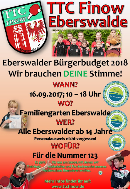 Während am Samstag eine große Delegation, bestehend aus 12 Spielern, 7 Trainern und vielen mitreisenden Eltern, bei der Verbandsrangliste weilen, wird im wunderschönen Eberswalder Familiengarten über viel Geld für uns abgestimmt.