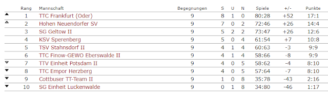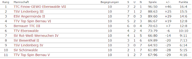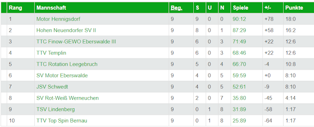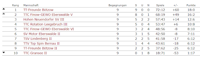 Unsere neue 9. Mannschaft, die hauptsächlich aus ehemaligen Spielern von TTV Eberswalde besteht, hat sich gut in der neuen Liga zurecht gefunden. Genauso wie unsere 8. Mannschaft kamen sie als Aufsteiger in die 2. Kreisklasse. Dort stehen sie nun im Mittelfeld.