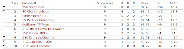 Nach 4 Niederlagen zum Start, konnte das wichtige 5. Spiel gegen den TSV Stahnsdorf zum Glück gewonnen werden. Es folgten aber 3 erneute Niederlagen ehe im sehr wichtigen letzten Spiel der Hinrunde noch ein Sieg gegen das Cottbuser TT-Team, die Hinrunde versöhnlich ausklingen ließ. Mit 4:14 Punkten steht das Team momentan auf dem 8. Tabellenplatz, der nach der Saison die Relegation bedeuten würde. Da mit Isa ein starker Joker in der Rückrunde das Team ab und an mal verstärken wird, sind die Chancen zum Klassenerhalt durchaus da. Doch auch die Damen aus Cottbus und Stahnsdorf sind nicht zu unterschätzen und werden mit Sicherheit noch den ein oder anderen Punkt sammeln.