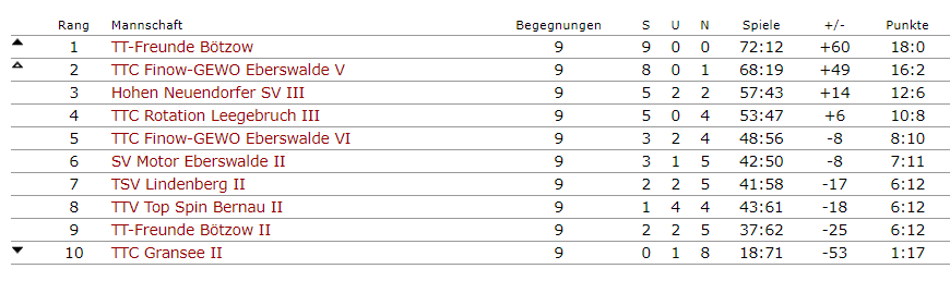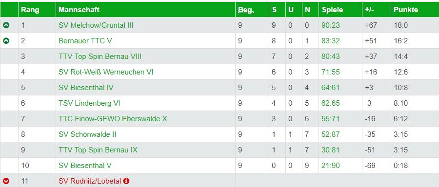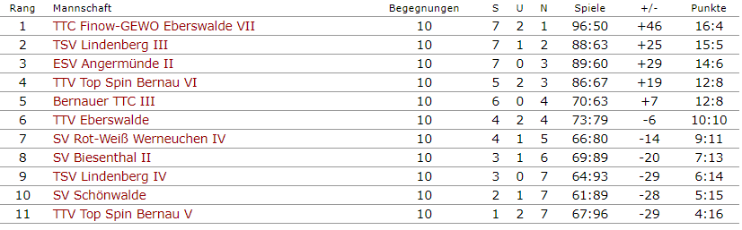 Unsere neue 9. Mannschaft, die hauptsächlich aus ehemaligen Spielern von TTV Eberswalde besteht, hat sich gut in der neuen Liga zurecht gefunden. Genauso wie unsere 8. Mannschaft kamen sie als Aufsteiger in die 2. Kreisklasse. Dort stehen sie nun im Mittelfeld.