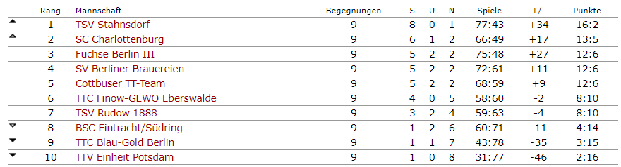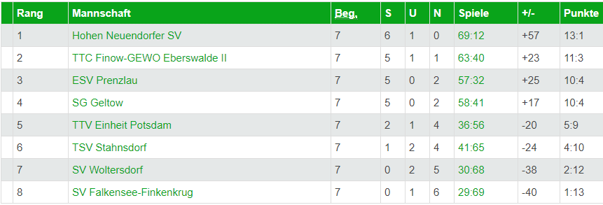 Nach 4 Niederlagen zum Start, konnte das wichtige 5. Spiel gegen den TSV Stahnsdorf zum Glück gewonnen werden. Es folgten aber 3 erneute Niederlagen ehe im sehr wichtigen letzten Spiel der Hinrunde noch ein Sieg gegen das Cottbuser TT-Team, die Hinrunde versöhnlich ausklingen ließ. Mit 4:14 Punkten steht das Team momentan auf dem 8. Tabellenplatz, der nach der Saison die Relegation bedeuten würde. Da mit Isa ein starker Joker in der Rückrunde das Team ab und an mal verstärken wird, sind die Chancen zum Klassenerhalt durchaus da. Doch auch die Damen aus Cottbus und Stahnsdorf sind nicht zu unterschätzen und werden mit Sicherheit noch den ein oder anderen Punkt sammeln.