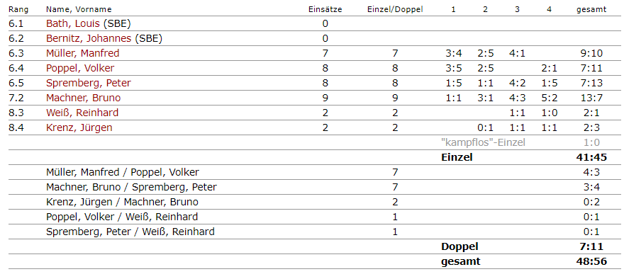 Wie erwartet konnte besonders Spitzenspieler und Mannschaftsführer Jörn Marschner mit einer tollen Bilanz überzeugen. Beim Rest des Teams ist mit Sicherheit noch Luft nach oben. Vielleicht springt ja nach 10:10 Punkten in der Hinrunde, in der Rückrunde ein positives Spielverhältnis heraus. 🙂