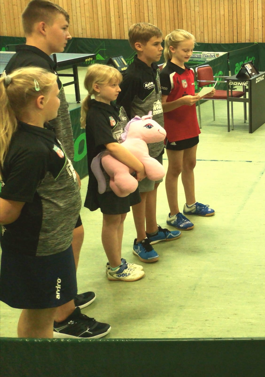 | Im ersten Match gegen Bernau, waren das einzige Mal alle 5 Stammspieler am Start. v.l.n.r.: Pia, Richard, Annelie, Elias, Anne |
