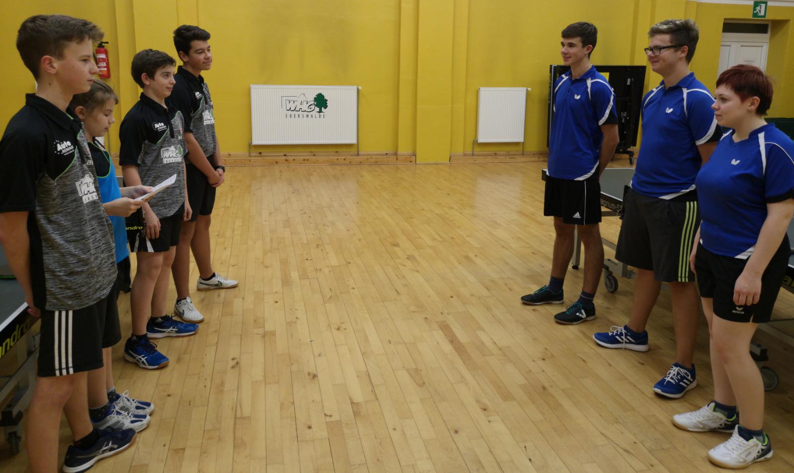 Die Erwartung bestätigten sich bereits in den Doppeln. An beiden Tischen konnten die Zuschauer tolle Ballwechsel bestaunen. Während Jojo und Louis recht sicher mit 3:1 gegen Musehold/Lorenz gewannen, lieferten sich Nils und Johannes einen wirklich spannenden Kampf mit Stamm/Bloßé. Beim Stand von 8:10 im 5. Satz behielten sie dann tatsächlich die Nerven und entschieden die nächsten vier Ballwechsel für sich. Mit einer komfortablen 2:0 Führung aus den Doppeln ging es also in die Einzel. Hier konnten leider erstmal weder Jojo noch Louis gegen Stamm bzw. Musehold überzeugen, so das die Fürstenwalder ausgleichen konnten. Im unteren Paarkreuz gab es nun zwei sehr spannende Spiele. Johannes, der heute ausschließlich auf das zuletzt bewehrte Abwehrspiel mit Noppe setzte, lieferte sich ein unglaublich intensives Match mit Gina. Die ersten drei Sätze gingen alle in die Verlängerung, in der Johannes leider einige Chancen liegen ließ. Beim Stand von 2:1 Sätzen für sich agierte Gina nun lockerer und gewann letztendlich verdient mit 3:1 das ansehnliche Match. Am Nebentisch sah es schon fast so aus als ob die 1. Einzelrunde komplett an die Fürstenwalder geht. Denn Nils lag im 5. Satz bereits mit 8:10 gegen Bloßè hinten. Doch wie bereits im Doppel behielt der 14-jährige die Nerven und drehte den Entscheidungssatz zum 12:10 Sieg. Ganz wichtiger Erfolg für uns! Zwischenstand: 3:3. Im oberen Paarkreuz präsentierten sich Jojo und Louis nun wie ausgewechselt. Jojo spielte gegen Musehold nicht nur stark, sondern zeigte auch einen großen Willen und Kampfgeist. So gewann er das Spiel mit 3:1. Louis konnte den starken Stamm, wie bereits bei der LBEM vor zwei Wochen, in den Entscheidungssatz zwingen. Hier behielt er diesmal die Nerven und gewann diesen deutlich! 5:3 Führung. Im unteren Paarkreuz konnte Johannes mit seinem Abwehrspiel Bloßé deutlich bezwingen, während Nils sich gegen die stark spielende Gina leider mit 1:3 geschlagen geben musste. 6:4 Führung!