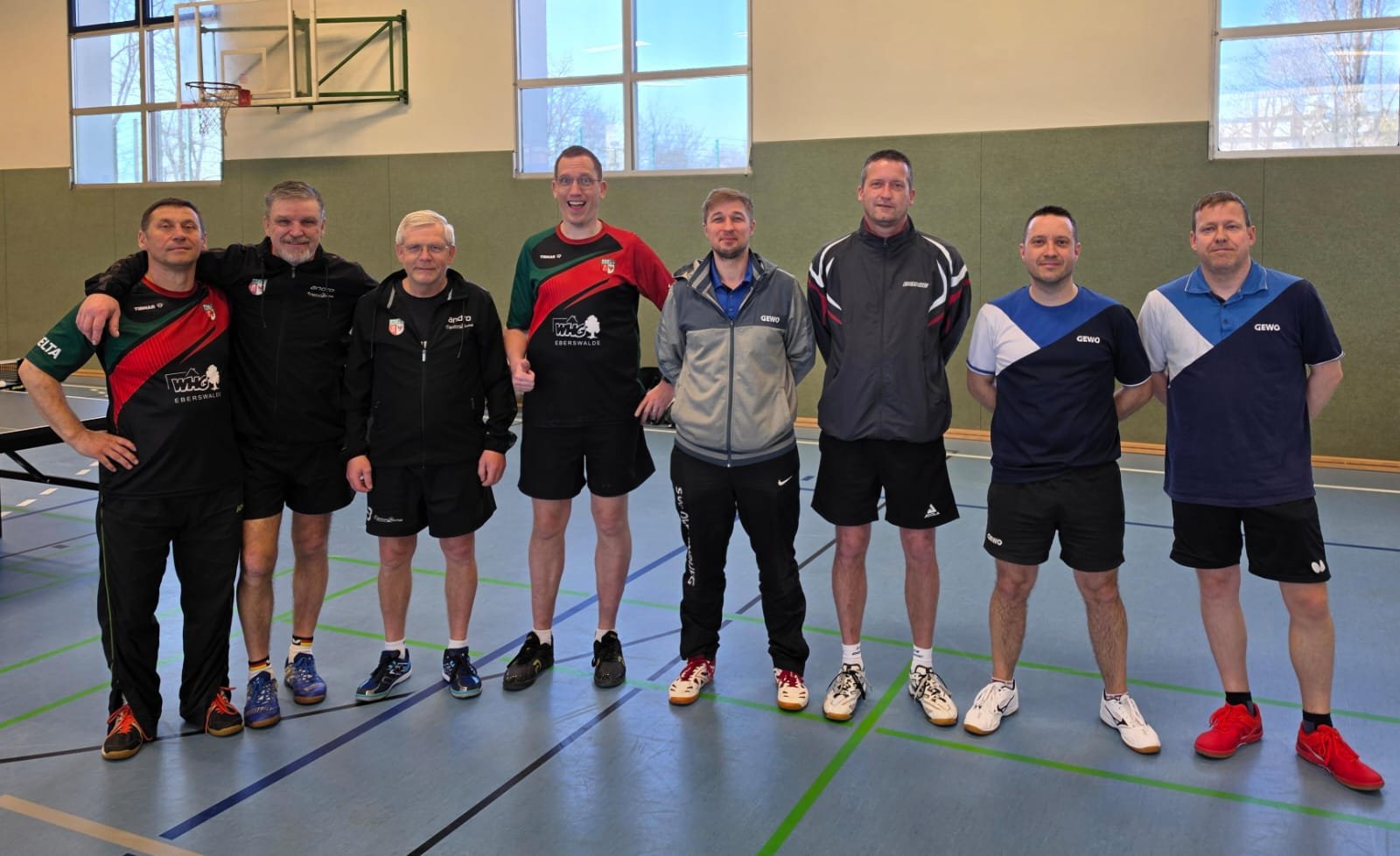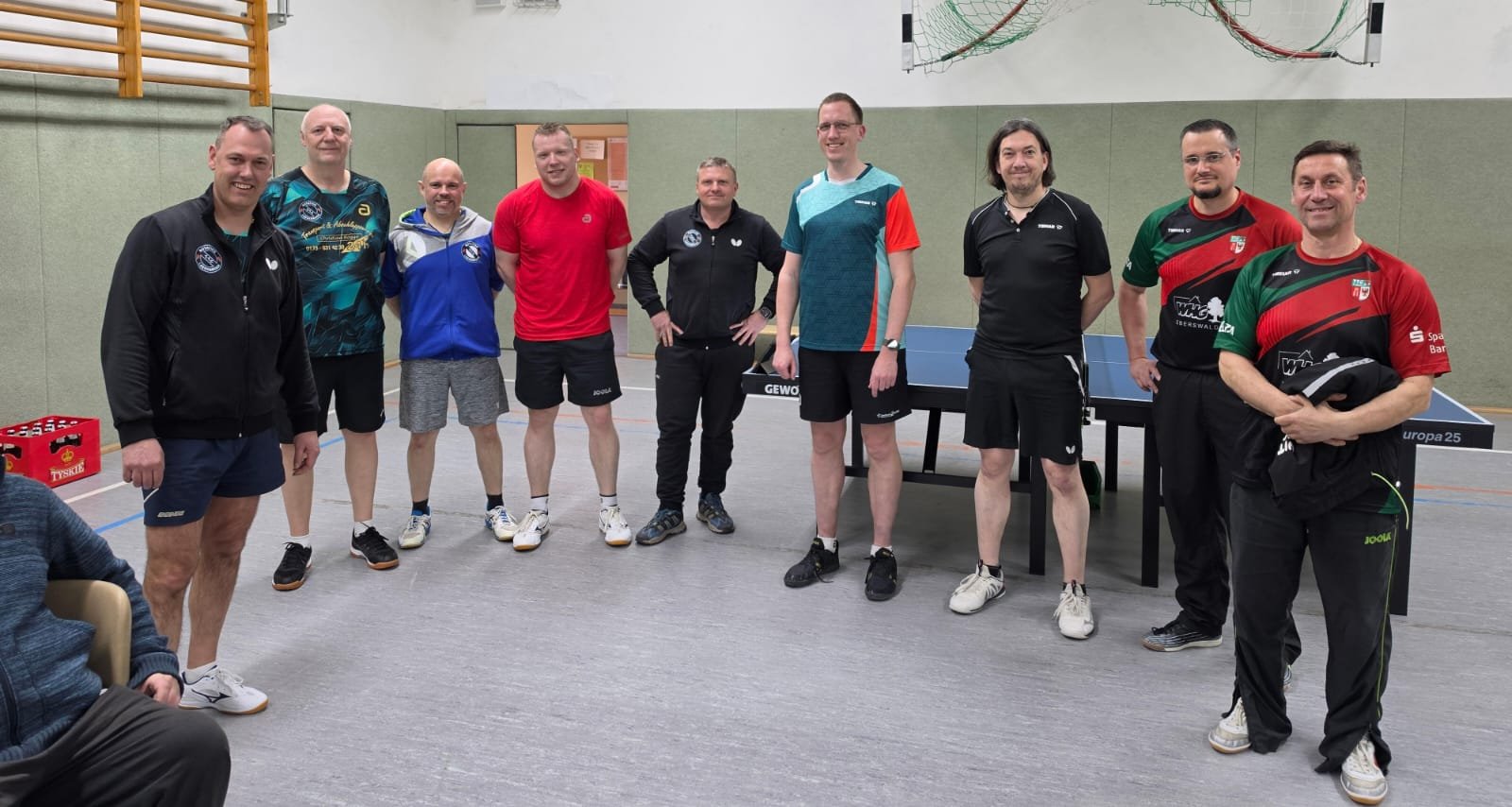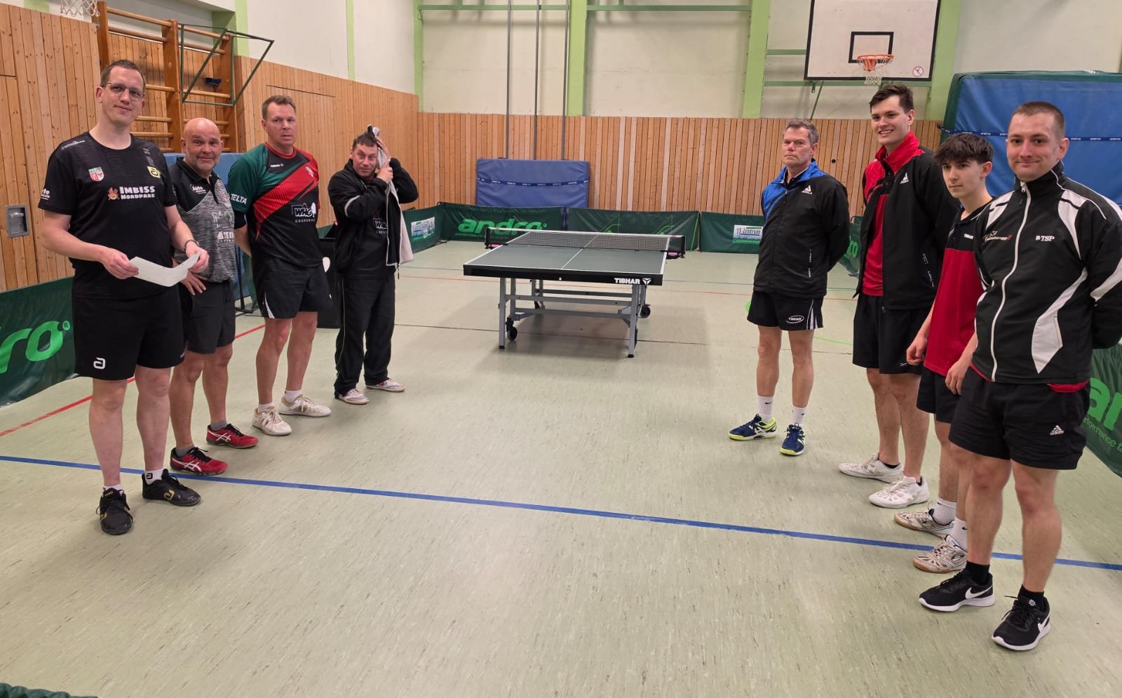 Gegen die ersatzgeschwächten Tabellenführer wurde ein offenes Spiel erwartet – und das wurde es auch. Gold wert waren die zwei gewonnenen Doppel. In den Einzeln konnte vor allem Johannes mit 3 Punkten überzeugen, während Andrzej, Marcus und Mario jeweils einen wichtigen Sieg beisteuerten. Das reichte gerade so zum knappen, aber sehr wichtigen 8:6-Mannschaftssieg.