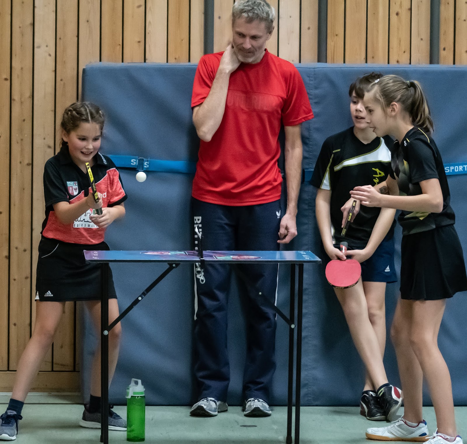 Doch neben dem Turnier, bei dem jeweils ein Satz Kind – Kind; Familienmitglied – Familienmitglied und das gemischte Doppel gespielt wurde, gab es mit dem Minitisch, dem Doppeltisch oder dem Chaostisch auch das ein oder andere Angebot um sein Ballgefühl zu testen.