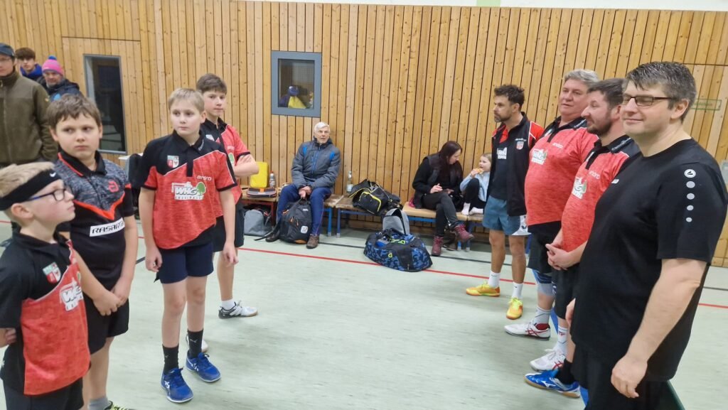 Das letzte Spiel der Woche fand am Freitag statt. Hier hatte die 6. Herrenmannschaft den TSV Lindenberg 2 zu Gast. Die Gäste kamen ersatzgeschwächt, doch spielten anfangs auf Augenhöhe mit. Erst nach einem 3:3 Zwischenstand konnte unser sehr junges Team, das u.a. vom Spitzenspieler unserer 1. Herrenmannschaft Matti gut gecoacht wurde, richtig aufdrehen und am Ende mit 11:3 gewinnen. Besonders das letzte Einzel zwischen Ricardo und Sportfreund Brüssow war richtig hochklassig, spannend und wurde von den Zuschauern stimmungsvoll begleitet. Am Ende gewann Ricardo dieses Einzel mit 14:12 im 5. Satz. Eine schöne Mannschaftsleistung unserer 6. Herrenmannschaft!