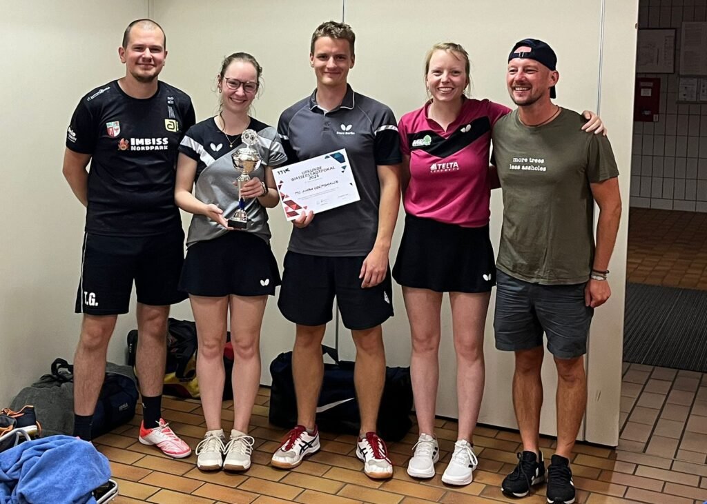 In Fürstenberg verbrachte am Samstag ein starkes Finower Quartett ihren Tag. Annie und Isa aus unserer 1. Damenmannschaft spielten gemeinsam mit Johann und Tom aus unserer 1. Herrenmannschaft in einem Team und gehörten somit mit zu den Turnierfavoriten. Relativ souverän spielten sie sich durchs Turnier und lieferten sich dann ein sehr umkämpftes Finale gegen Werneuchen. Am Ende stand es 3:3 so dass die Sätze entscheiden mussten. Hier war unser Team um einen Satz besser, so dass sie sich über den Turniersieg freuen durften.