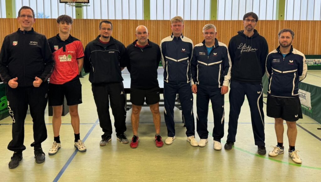 Unsere 1. Herren begann um 13 Uhr und lag nach zwei umkämpften Doppelniederlagen mit 0:2 hinten. Nun sollte in den Einzeln der Rückstand egalisiert werden, was auch schnell gelang. Doch zum Sieg reichte es am Ende leider nicht mehr. Der Heimvorteil der Gastgeber mit den langsamen Bällen und Tischen war zu groß, um das ein oder andere Einzel, in dem unser Team eigentlich favorisiert war, für sich zu entscheiden. Somit musste man sich nach über vier Stunden Spielzeit mit dem 7:7 zufriedengeben.