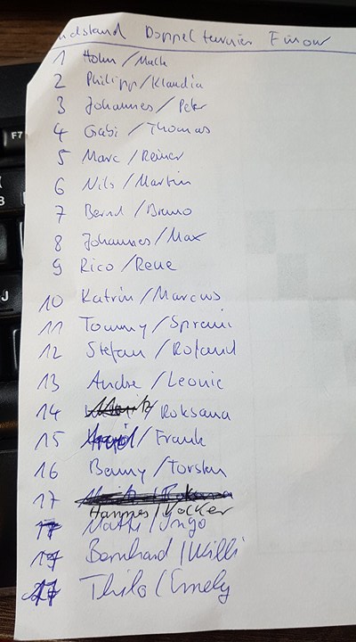 So wurde mit Roland und Stephan ein eingespieltes Pauli-Doppel zusammengelost. Beide erreichten letztendlich aber nur den 12. Platz. Sehr ausgeglichene Doppel waren außerdem auch Gabi & Thomas sowie Katrin & Marcus. Doch auch Katrin und Marcus konnten die vorderen Plätze nicht angreifen und landeten auf Platz 10. Ein Nachwuchsdoppel bildeten Johannes B. und Max. Beide gewannen überraschend ungeschlagen ihre Gruppe, ehe sie in der Zwischenrunde unsanft ausgebremst wurden. Am Ende reichte es immerhin zu Platz 8. Marc wurde wie bereits vor 2 Jahren erneut Reiner zugelost. Beide kannten sich also schon recht gut und schafften es auf den guten 5. Platz. Überraschend auf dem Podest landeten Johannes G. und Peter. Durch viele gute Spiele durften sie sich am Ende über den 3. Platz freuen.